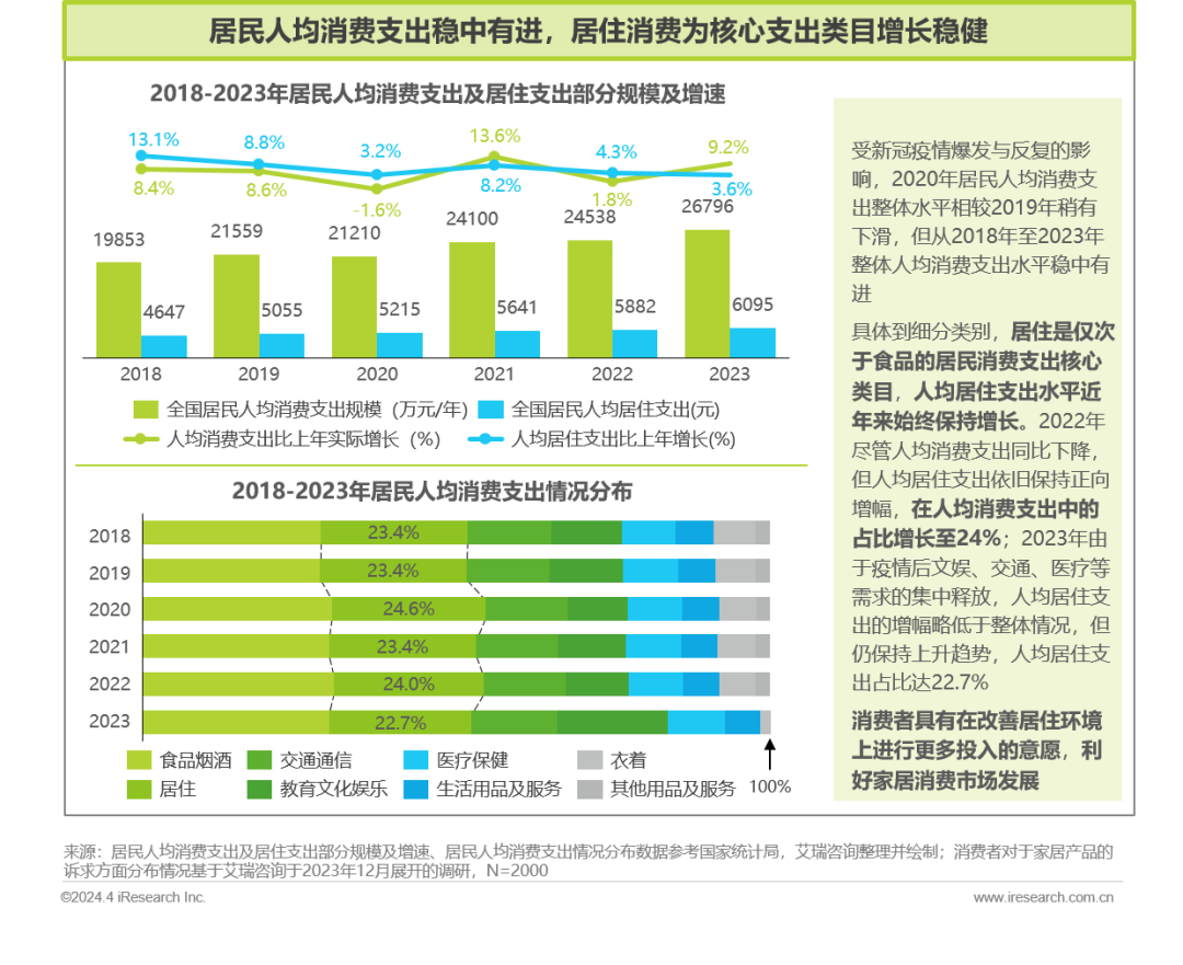 居住消费支出增幅高于整体增幅,消费者具有在改善居住环境、提升居住体验上增加投入的意愿