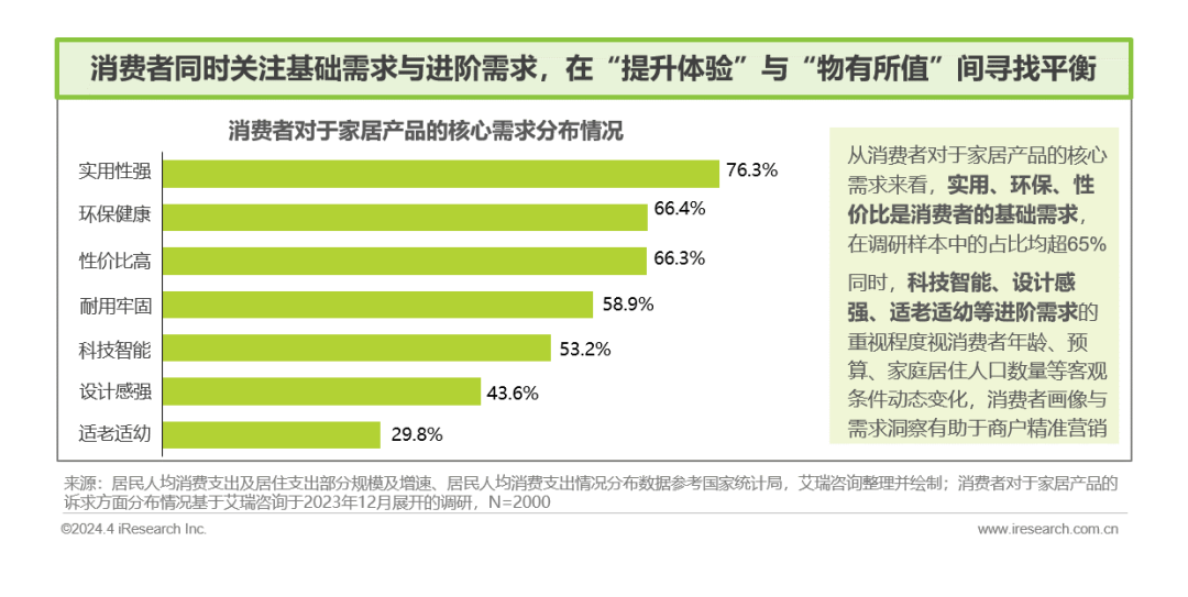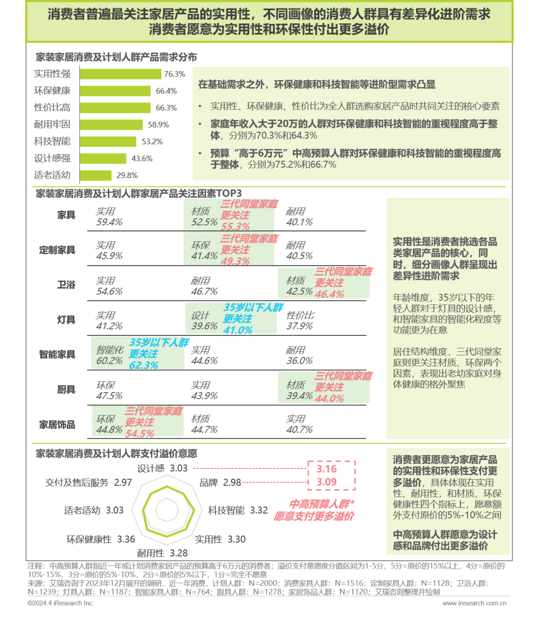 消费者首要关注产品实用性,环保健康、科技智能等进阶型需求凸显,细分品类关注点差异化分布