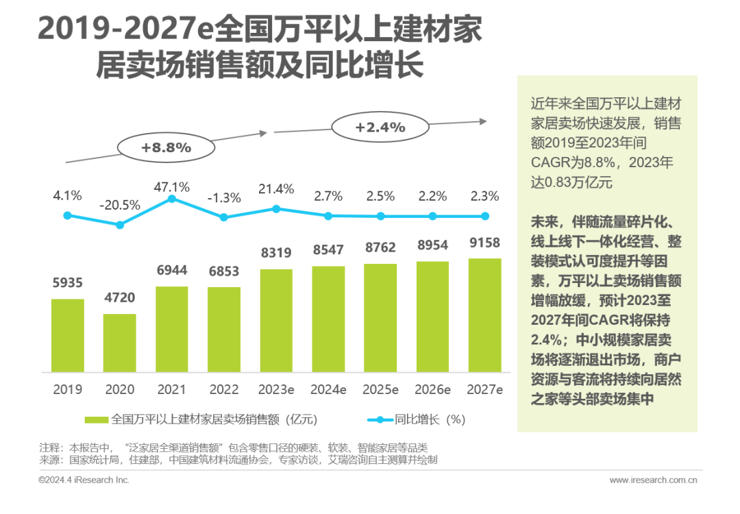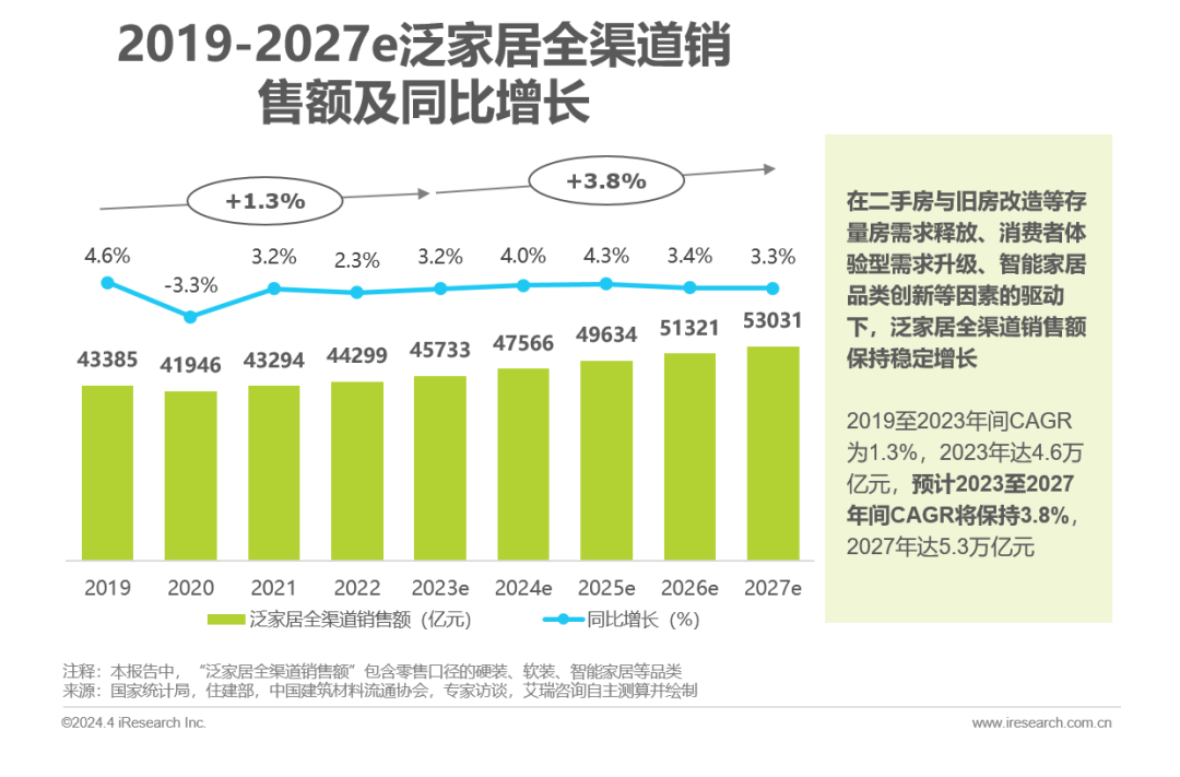 泛家居全渠道销售额2023年达4.6万亿元,2027年预计超5.3万亿元,在存量房需求释放与智能家居品类创新推动下展现强劲增长弹性