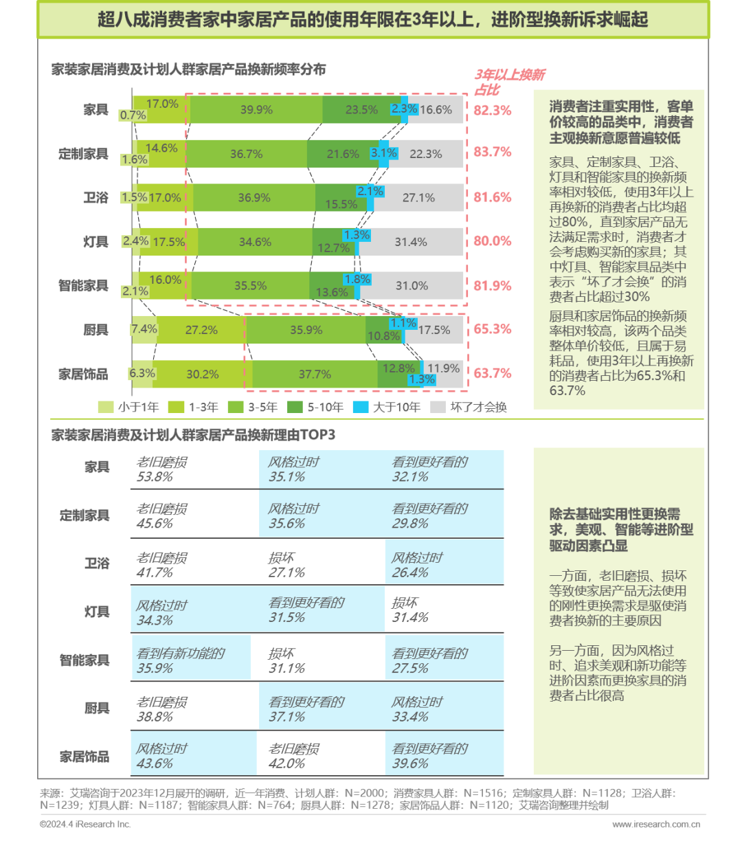 多数消费者的家居产品使用年限在3年以上,追求实用和美观智能为主要换新动机