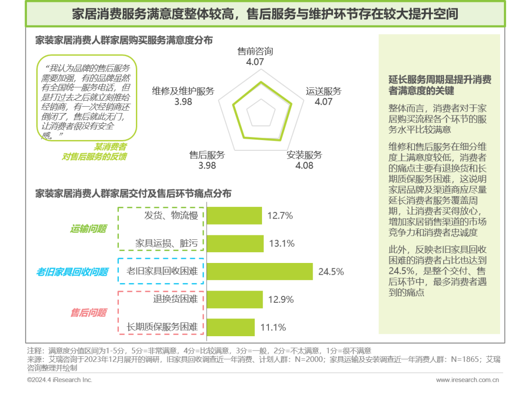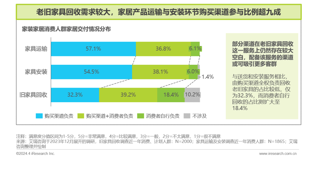 家居购买服务满意度整体处于较高水平,老旧家具回收服务仍存在需填补的空白,售后服务需进一步向标准化、长周期发展