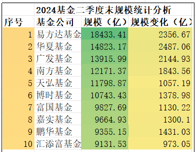 具体到资产规模前10 的基金公司,数据显示,TOP10基金公司的资产规模均出现增长,其中,易方达基金、华夏基金、广发基金的规模增加2000亿以上,南方基金增加1844亿。除了汇添富基金增加973亿,其他基金资产增加均在1000亿以上,1500亿以下。