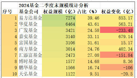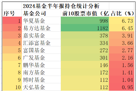 从规模上看,股票持仓前10市值上千亿的仅易方达基金公司一家。