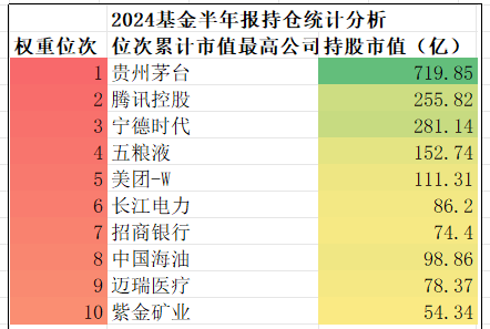 在TOP10 基金公司持仓前10股票名单中,不同基金公司名单不同,同一股票即使在不同基金中出现,位次也不一样。根据各家基金公司从1到10的名单中,某家上市公司出现的位次、频次与累计持股市值,公司研究室做了一个粗略统计。