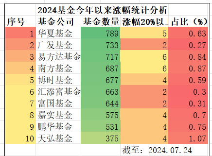 数据显示,截至7月24日收盘,TOP10基金公司中,净值上涨超过20%的产品都不多,总计39只。这些产品多为权益产品。显然,在今年以来剧烈震荡的市场行情中,能获得20%以上的收益相当困难。