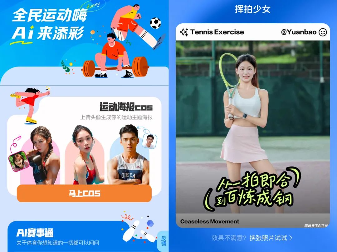 据了解,腾讯元宝不但满足效率需要,也在不断丰富日常生活场景的应用,同时积极将AI技术和各行业场景融合,比如此次结合运动赛事的创新玩法,就是大模型+体育文化产业的尝试。文娱价值官尝试后发现,只需上传一张照片,就可以在“AI巴黎秀场”解锁专属的奥运运动风海报,还能和“总台名嘴”合拍同框,参与感十足。