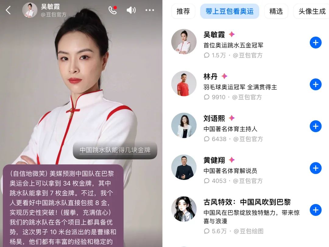 智能AI助手豆包宣布:携手跳水奥运冠军吴敏霞、羽毛球奥运冠军林丹、体育解说员刘语熙等共同打造专属奥运智能体,用户可以在豆包App中和他们畅聊奥运话题。同时,豆包网页版也将上线“AI带你解读奥运”专区,为用户提供奥运新闻早晚报、赛事回放、AI解说等内容。