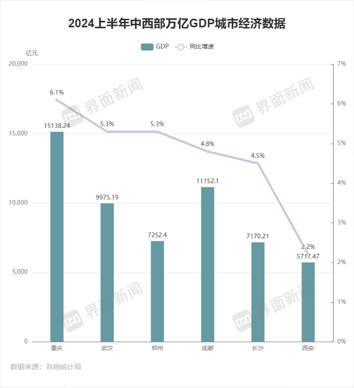 2024年上半年,西安GDP为5717.47亿元,按不变价格计算,同比增长2.2%,该增速在中西部万亿城市中是最低的。在全国万亿城市中,除了暂未公布数据的佛山,西安的增速也是最低的。