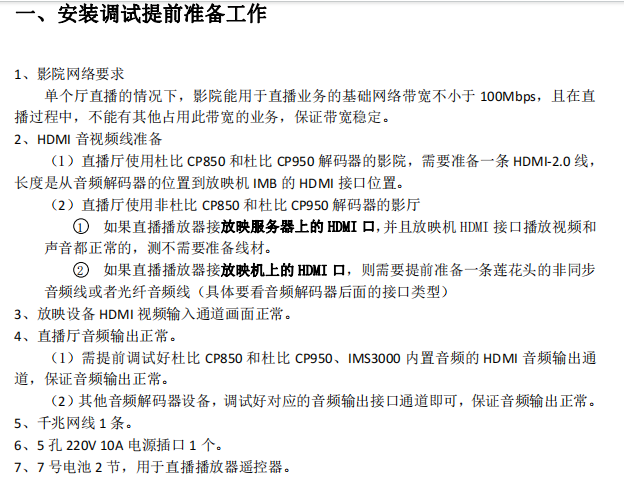 报名通过后,还有一轮技术调试,中影会为报名的影城下发一份调试文档,里面详细标明了带宽、音视频的标准。例如单个影厅直播,影城用于直播业务的基础网络带宽不小于100Mbps,像东尚影城在直播前还专门升级了宽带,保证观影的流畅性。