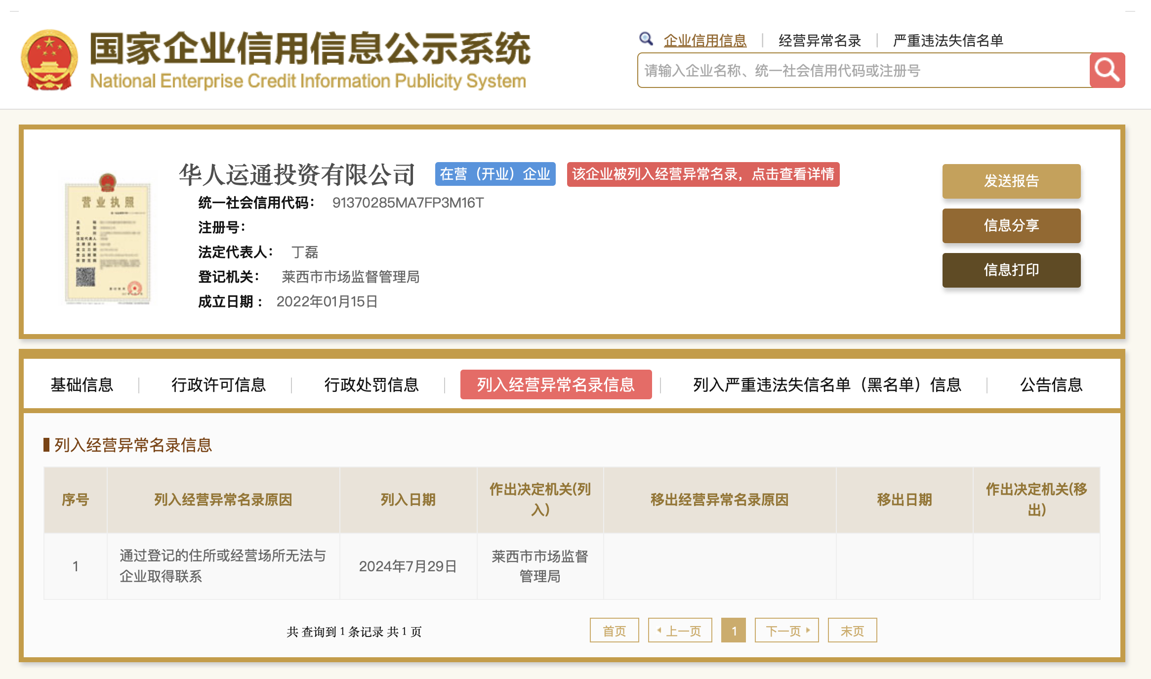 天眼查App显示,近日,华人运通投资有限公司因通过登记的住所或经营场所无法取得联系,被莱西市市场监督管理局列入经营异常名录。