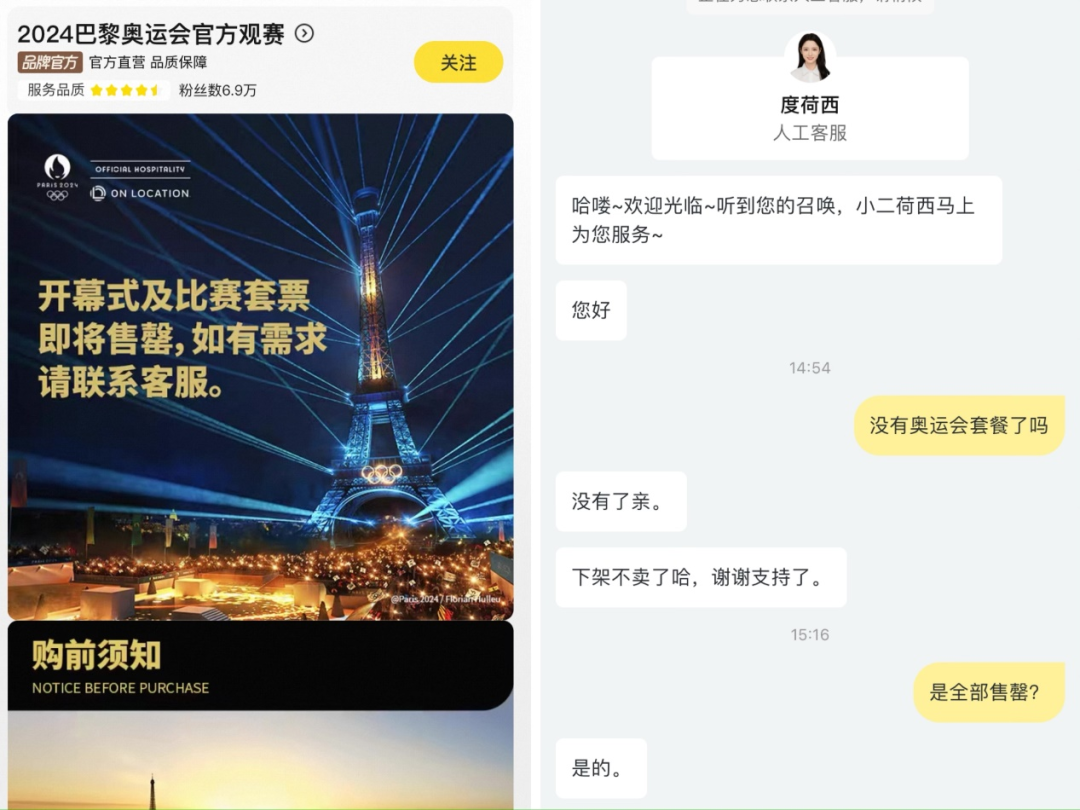 其中,在阿尔玛桥上的巴黎传统小酒馆里一边就餐一边观赏仪式的“桥上360套餐”目前已售罄。此外,部分热门赛事场次的套餐也已售罄。截至7月底,锌刻度咨询2024巴黎奥运会官方观赛旗舰店客服时,对方表示,没有奥运会套餐了,“下架不卖了。”