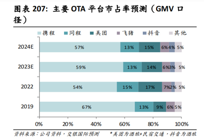 直观的数据显示:从市场占有率来看,交银国际预测预计抖音酒旅在2023年的市占率将从2%提升到3%;携程提升了5个百分点,飞猪下滑了1个点。