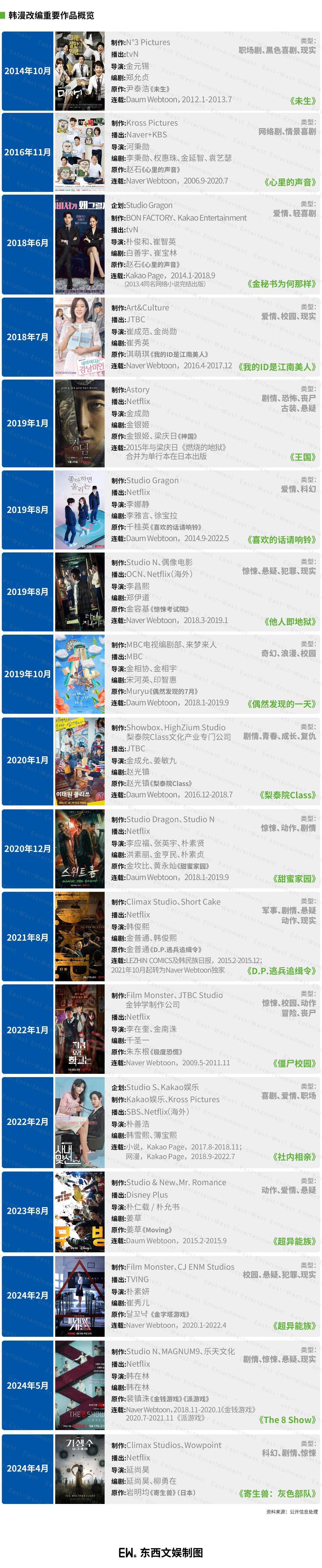 在疫情红利加持与电影业人力流入下,凭借Netflix的大规模制作投资、全球发行网络,漫改在内的韩剧在2019年后迎来井喷式发展,数量、质量、类型上都有了很大提升。