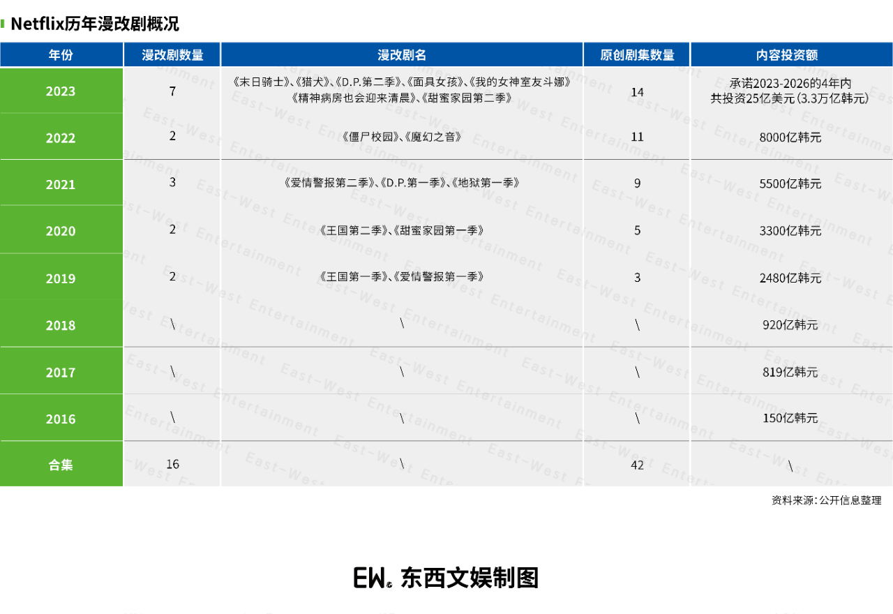 2019~2022年间,包括2022年拍摄、2023年播出的7部独播漫改剧在内,Netflix先后上线了16部漫改剧,占Netflix原创韩剧的38%。
