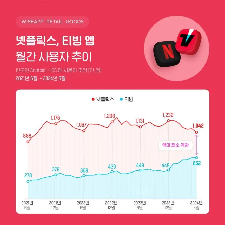 与1月份的149.7万相比,6月TVING和Netflix的DAU差距只有31.5万,在短短5个月内缩小了79%。