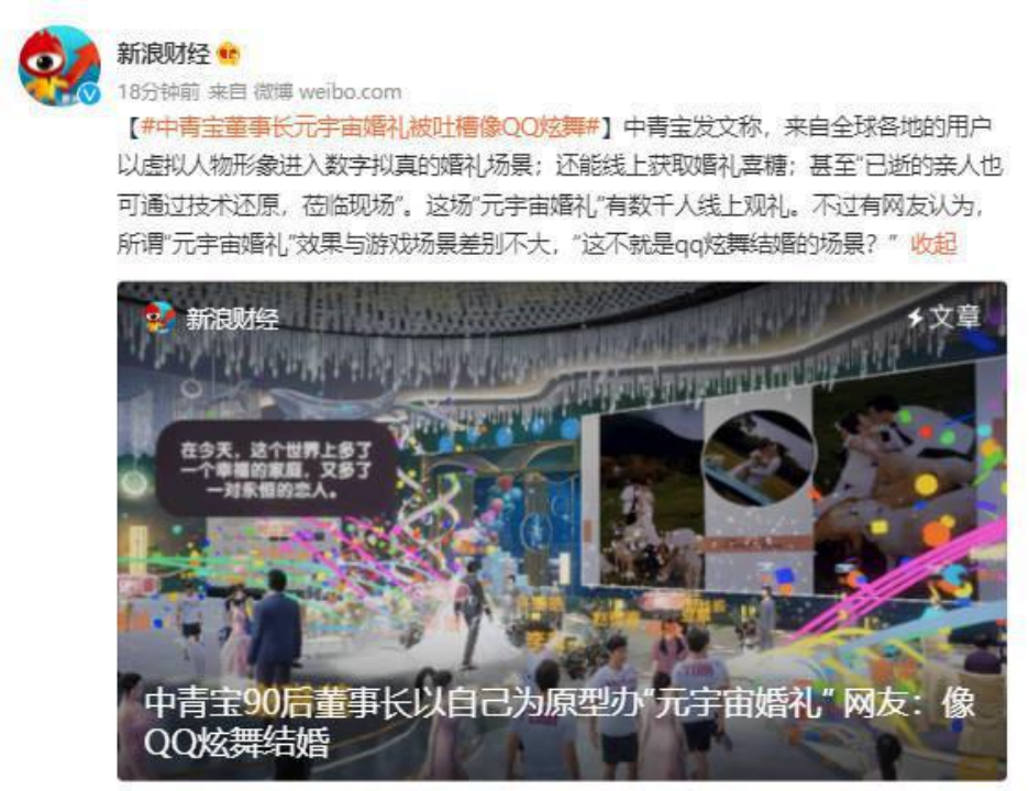 据当时报道,这场元宇宙婚礼有数千人在线上进行观礼。不仅可以让宾客们零距离围观新人入场,交换戒指,还能送祝福、随份子钱、领喜糖、抽iPhone伴手礼进行互动。虽然元宇宙婚礼听起来极为前沿酷炫,但有网友吐槽,看起来像是QQ炫舞。
