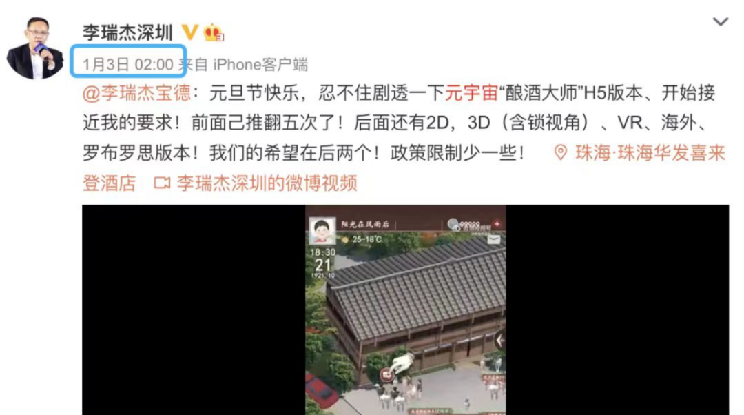 2022年1月3日凌晨2点,李瑞杰发了一条微博:“忍不住剧透元宇宙《酿酒大师》H5版本……”到了1月5日,中青宝股价涨停。