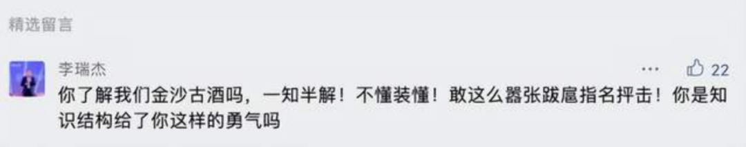 李瑞杰留言评论道,“你了解我们金沙古酒吗,一知半解!不懂装懂!敢这么嚣张跋扈指名抨击!你是知识结构给了你这样的勇气吗?”