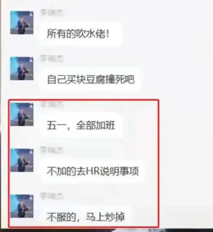 其实李瑞杰的暴脾气这几年已经收敛了不少,早在2022年五一,李瑞杰就因为群截图言论出圈:“我想打爆你们所有人”、“自己买块豆腐撞死吧”、“五一全部加班”、“不服的,马上炒掉”。