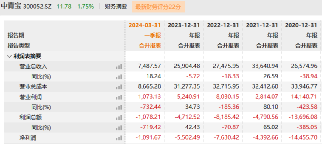 中青宝的业绩却长期处于不佳状态:从2020年到今年一季报,净利润连续4年为负;2023年营业收入同比下降。