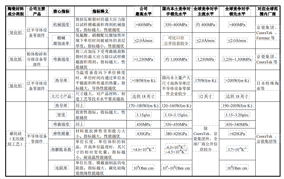 在先进陶瓷材料领域,公司先进陶瓷材料零部件已大批量生产的产品处于国内领先水平,并且多项核心指标已达到全球竞争对手主流水平。尤其重要的是,在半导体设备用高纯度氧化铝、高导热氮化铝等“卡脖子”产品方面不同程度上实现了国产替代,填补了本土企业在这一领域的空白。