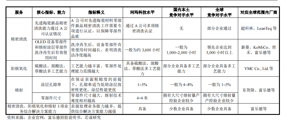 在先进陶瓷制造之表面处理工艺方面,公司先进陶瓷新品的精密清洗已通过全球知名泛半导体设备厂商A公司的认证;在对外表面处理服务方面,公司在洗净再生处理洁净度、熔射涂层品质和大尺寸零部件熔射等方面处于国内领先水平,且表面处理综合服务方案提供能力较强。