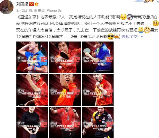 除了比赛阵容是地表最强12人之外,本届赛事,解说阵容同样相当豪华。刘国梁公布的解说阵容中,包括了王楠、张怡宁、陈静、王励勤、马琳、王皓、刘伟、陈玘、邱贻可、黄飚、孔令辉和刘国梁本人,这样强大的阵容几乎是史无前例。值得注意的是,刘国梁、孔令辉、王楠、张怡宁、张继科、丁宁和马龙都是大满贯得主,全世界10位乒乓大满贯选手中只有邓亚萍、李晓霞、瓦尔德内尔等三人不在场。