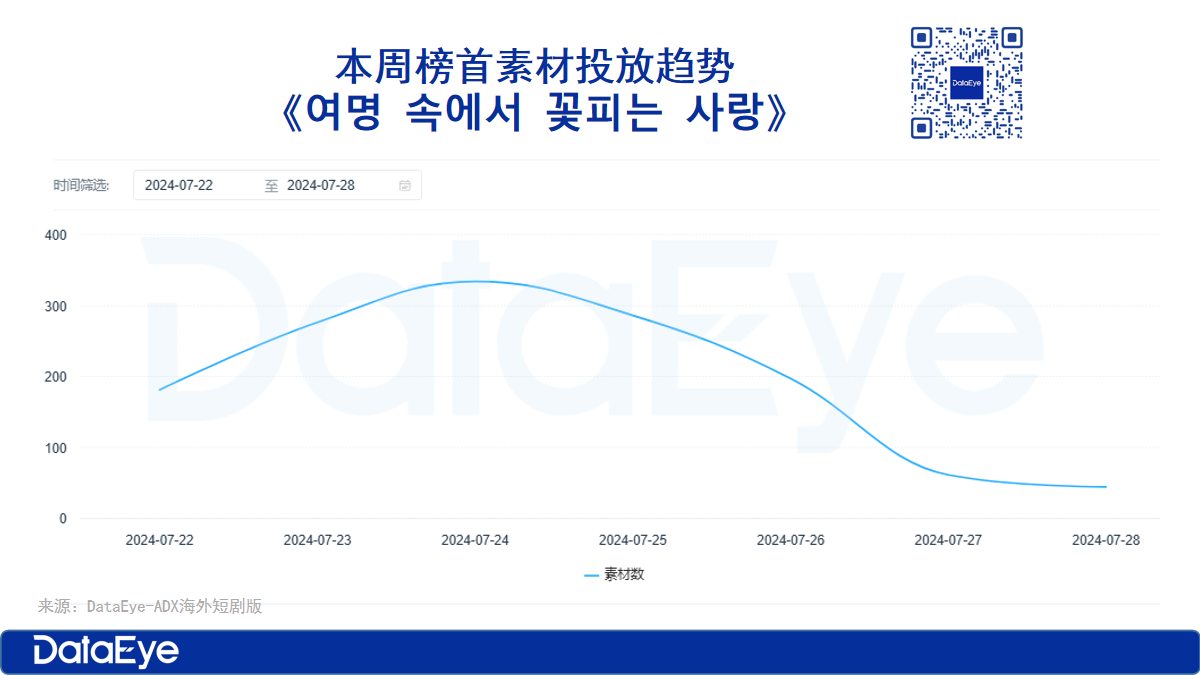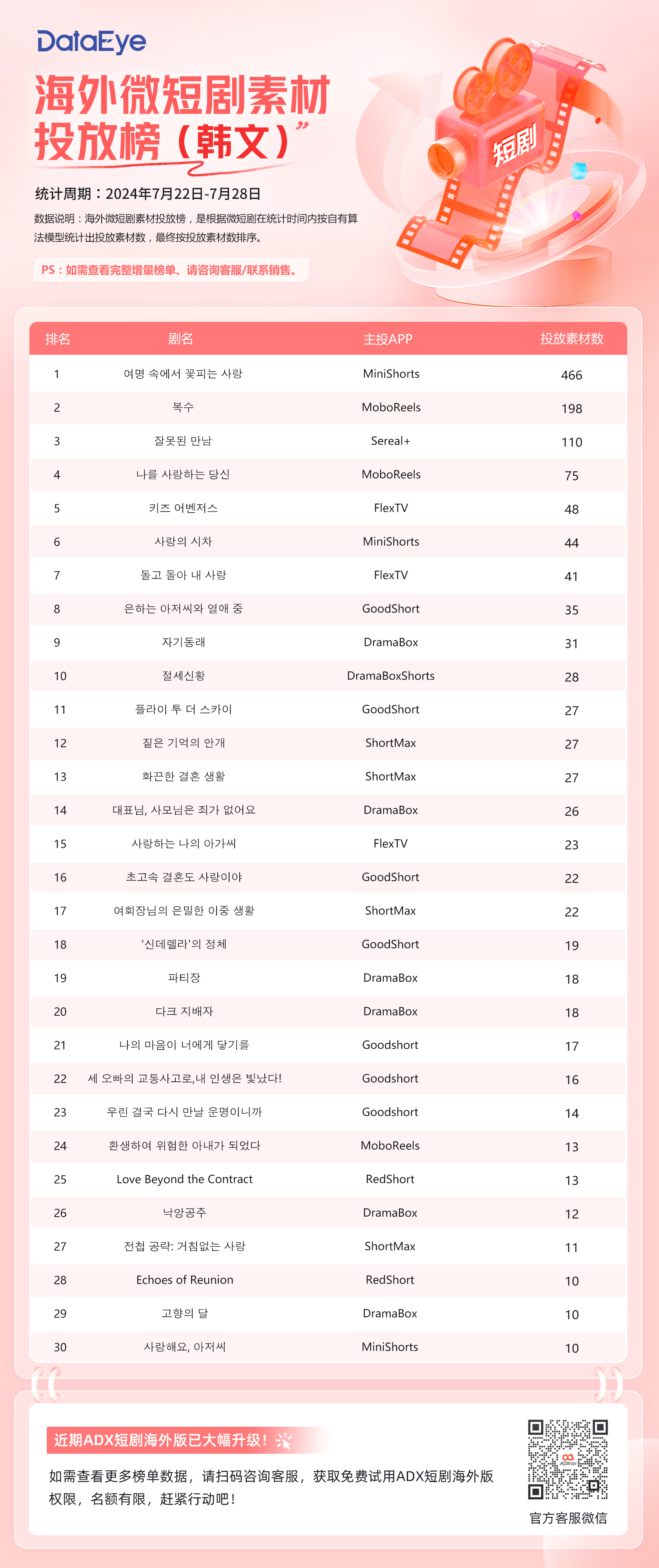 本期(7月22日-7月28日)DataEye海外短剧素材投放榜韩文榜,短剧《여명 속에서 꽃피는 사랑》登顶,投放素材数466组,主投MiniShorts;《복수》第二,投放素材数198组,主投MoboReels;《잘못된 만남》位列第三,投放素材数110组,主投Sereal+。