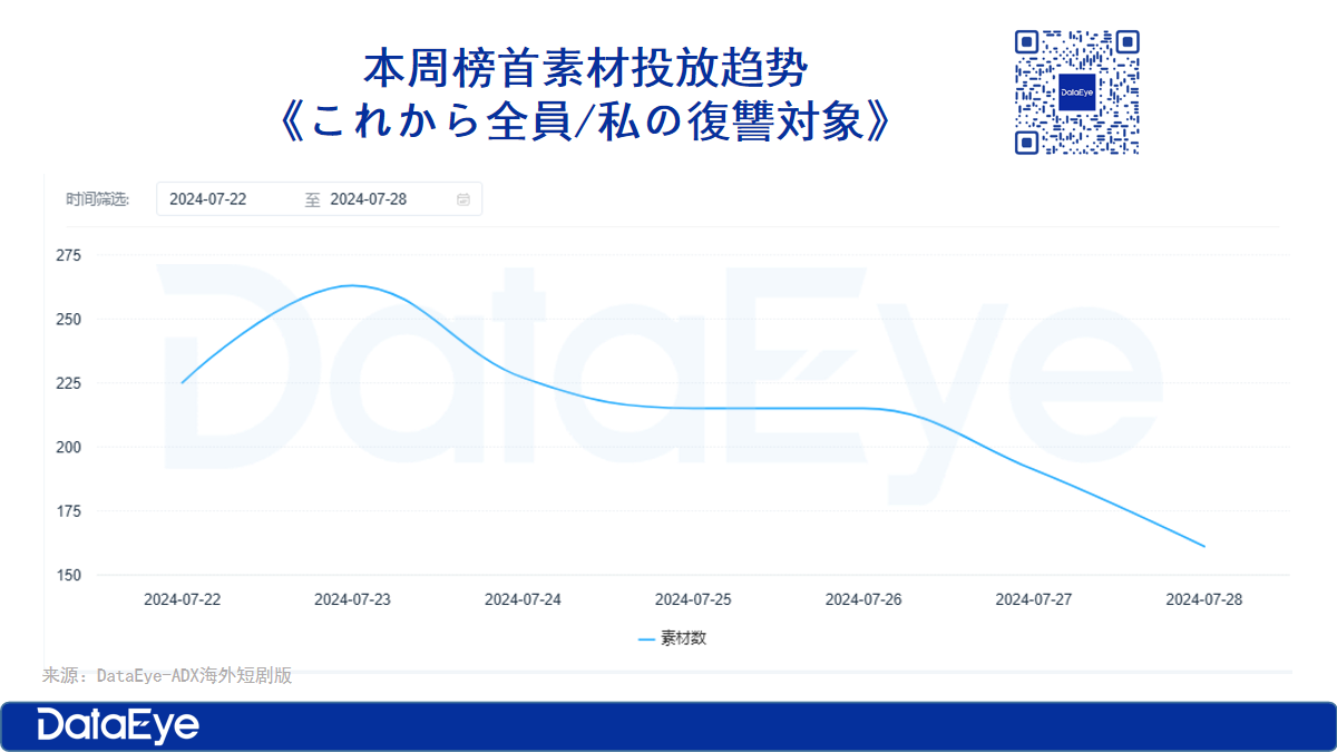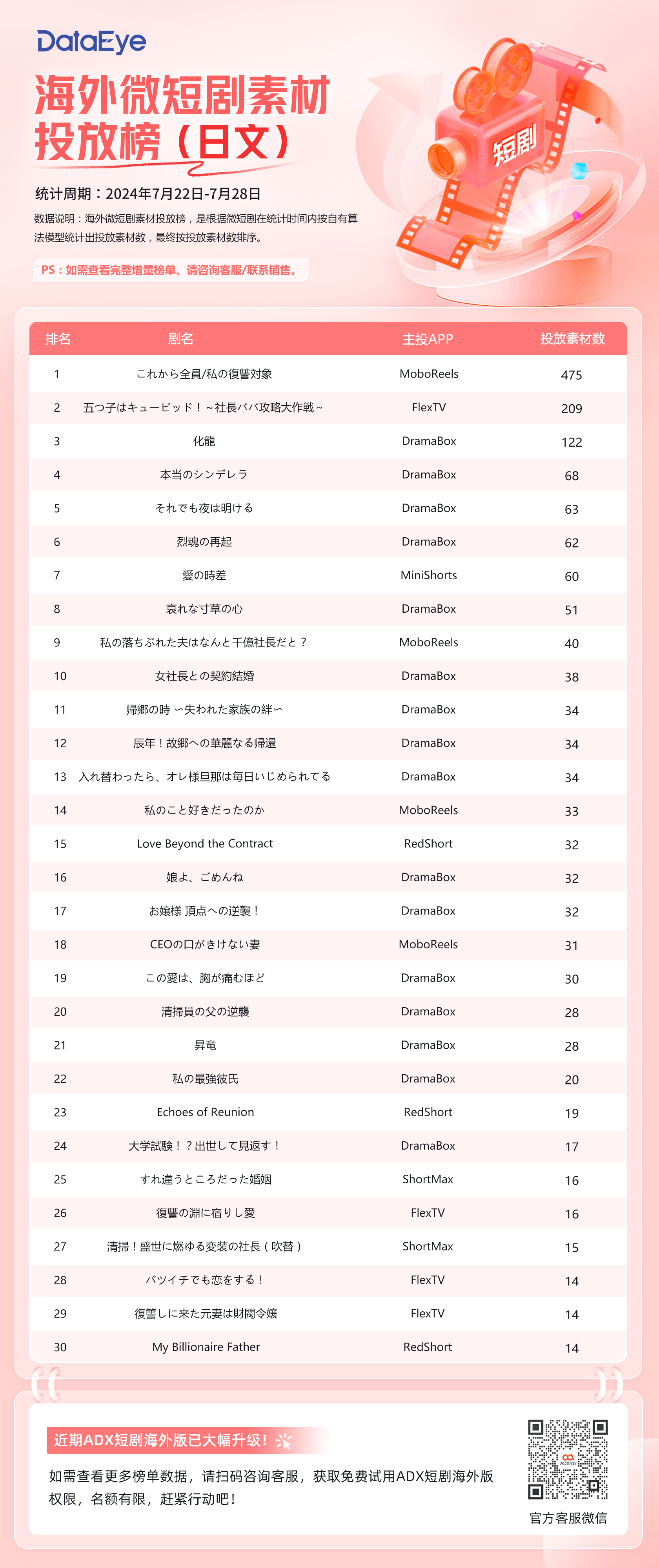 本期(7月22日-7月28日)DataEye海外短剧素材投放榜日文榜,复仇题材短剧《これから全員/私の復讐対象》登顶,投放素材数475组,主投MoboReels;《五つ子はキューピッド!~社長パパ攻略大作戦~》第二,投放素材数209组,主投FlexTV;《化龍》位列第三,投放素材数122组,主投DramaBox。
