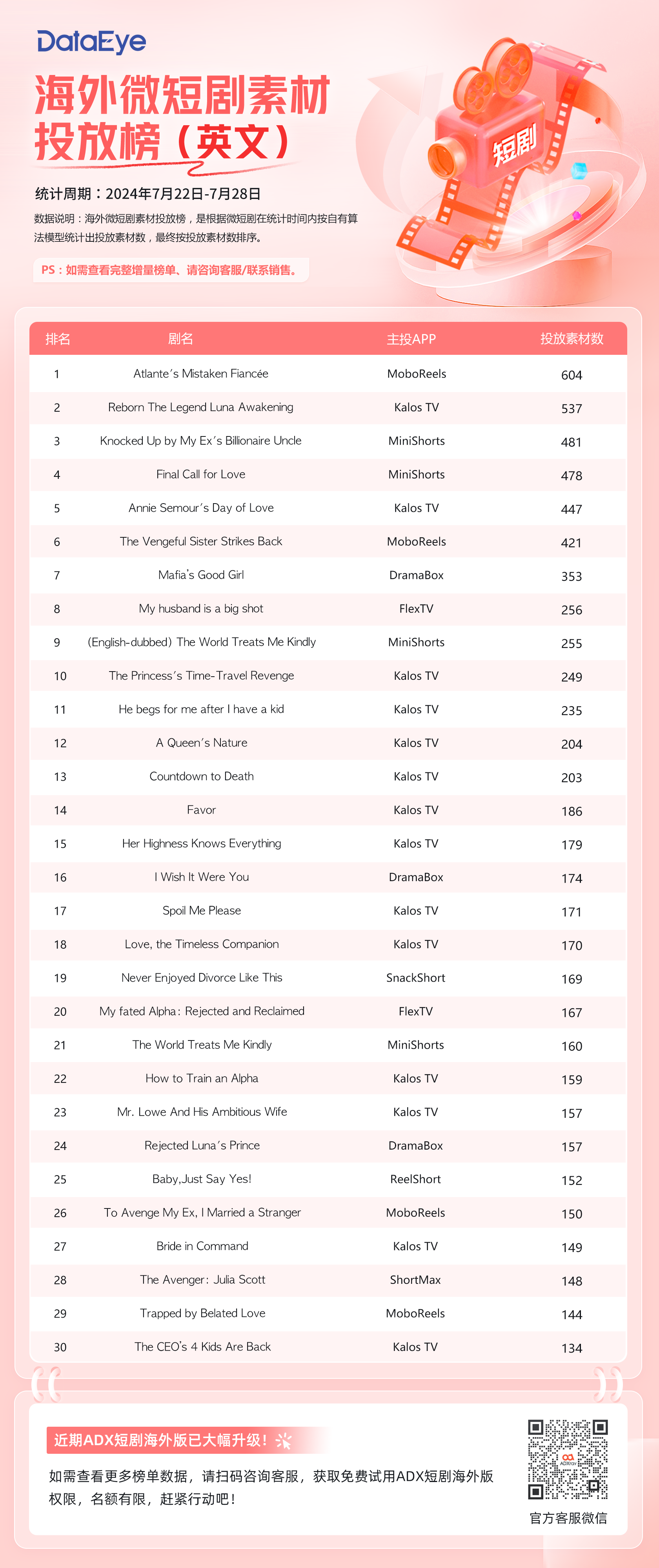 本期(7月22日-7月28日)DataEye海外短剧素材投放榜英文榜,短剧《Atlante's Mistaken Fiancée》登顶,投放素材数604组,主投的短剧APP为MoboReels ,占100%;《Reborn The Legend Luna Awakening》第二,投放素材数超537组,主投的短剧APP为Kalos TV ;《Knocked Up by My Ex's Billionaire Uncle》位列第三,投放素材数481组,主投的短剧APP为MiniShorts。TOP3的短剧均为海外拍摄的本土剧。