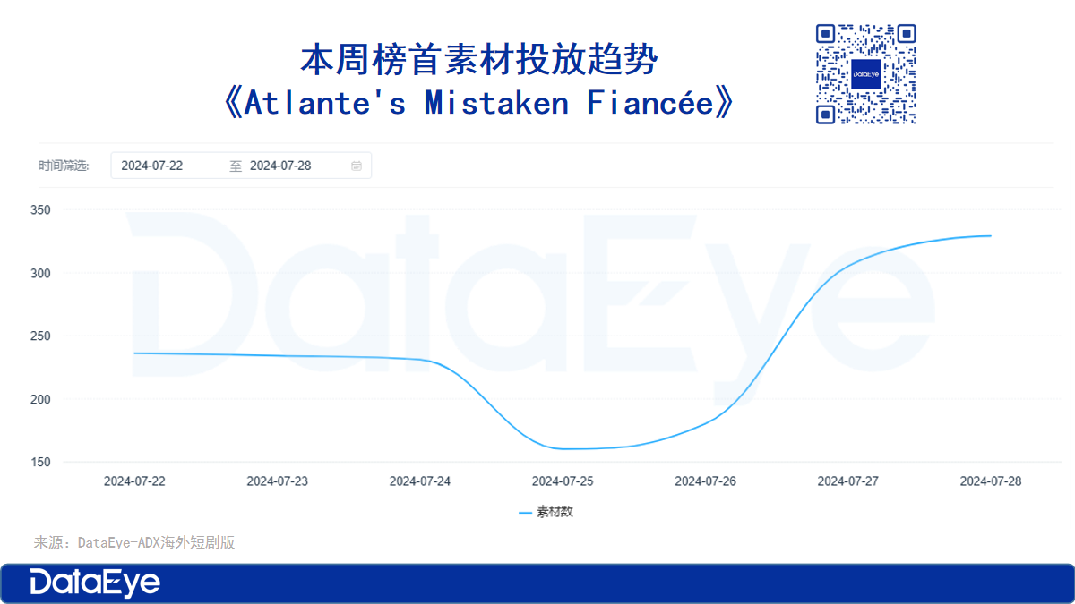 从投放趋势来看,榜首《Atlante's Mistaken Fiancée》在7月28日投放素材数最多,共329组。该剧本周在Messenger、Facebook和Instagram等媒体平台均有投放短剧素材。该剧近七天主投的地区为欧美市场,在美国投放的素材数最多,为557组,占比99.82%。
