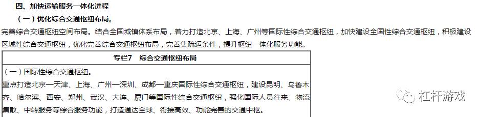 “十三五”现代综合交通运输体系发展规划,首先提出着力打造北京、上海、广州等国际性综合交通枢纽。其次,才给天津、深圳、成都、重庆加冕——提出:重点打造北京—天津、上海、广州—深圳、成都—重庆国际性综合交通枢纽。