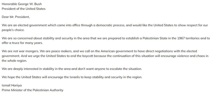 信中指出新政府是通过民主进程选出的政府,呼吁美国尊重巴勒斯坦民众的选择。哈尼亚表示新政府准备让巴勒斯坦建国,愿意“在今后很多年停火”。他称哈马斯政府不是“好战分子”,呼吁美国政府与巴勒斯坦当选新政府展开直接对话,希望美国能鼓励以色列维持该地区和平稳定。