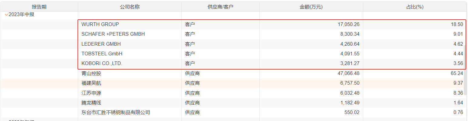 以2023年上半年其第一大客户Wurth Group为例,2023年上半年,该公司与Wurth Group交易发生额达1.71亿元。作为紧固材料行业的领导者, Wurth 是紧固件、化学品、安全产品、工具和库存管理解决方案的批发商,适用于汽车、化工、工具和众多其他应用。