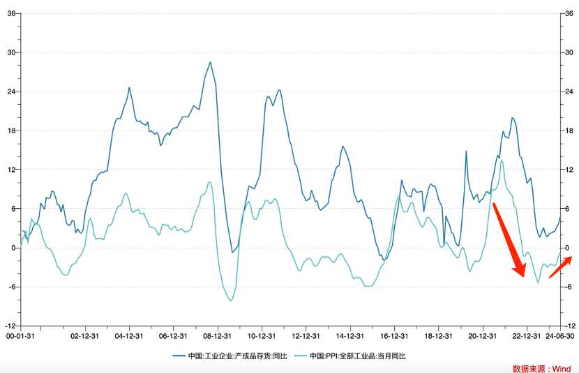 自2021年以来,我国经历了一轮力度非常之大的去库存工作,PPI和存货同比双双下行,但2024年以来,上图中两条折线均出现了明显的筑底迹象,第二季甚至出现了双双上行的趋势。