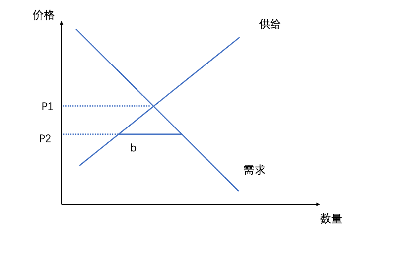 我们都知道供需关系决定价格,两种因素决定产品的公允价值为P1,如果平台强行要把价格打下来到P2,当短期内供需关系不发生大变化的背景下,低价将会导致供给减少,b段的需求无法被满足(这也是最近商家以次充好应对低价的主要原因,本质上商家在降低供给)。