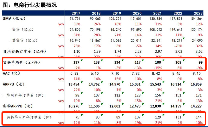 2020年堪称为我国电商行业的分水岭,在此之前行业发展靠双轮驱动(用户年订单量和平均单价),呈现了量价齐飞的美好状态,其后用户订单仍然放大,而客单价开始大幅下跌。