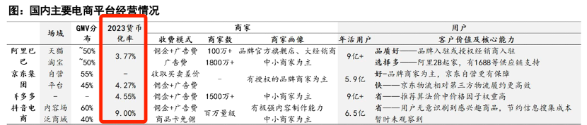 2023年抖音电商的货币化率飙高至9%,拼多多货币化率也超过了4.5%,但这两家平台恰好是近年增速最快的平台。用货币化率去判断平台吸引力是不够客观的,还要考虑其“成长性”,当商家急于去库存是顾不得货币化率高低的,上述两家平台的增速有目共睹,商家愿意在平台花费更多。