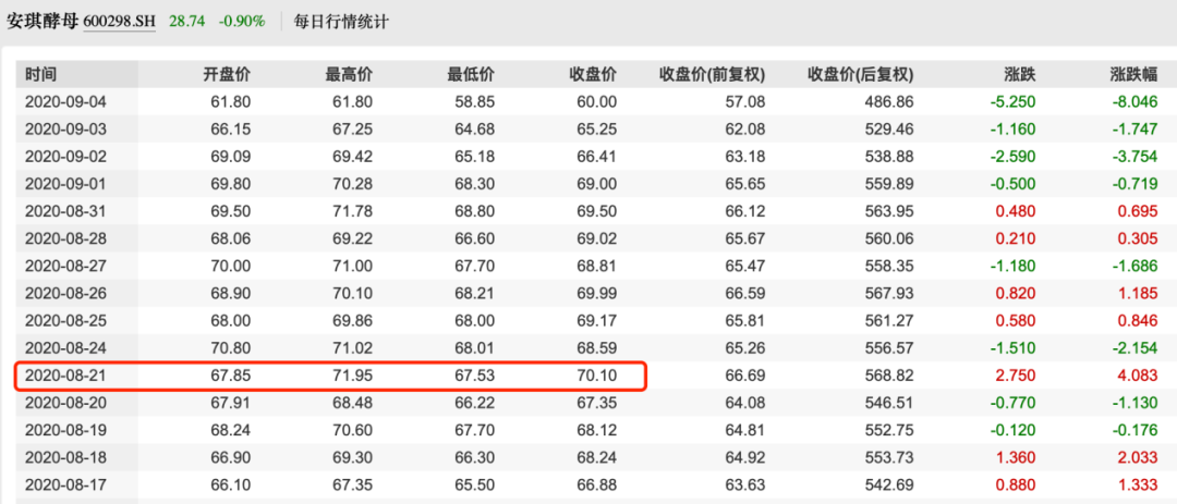 上市后,安琪酵母在资本市场也曾表现不俗。2020年8月21日,公司的收盘价(前复权)一度达到了66.69元/股,市值达到578亿元。