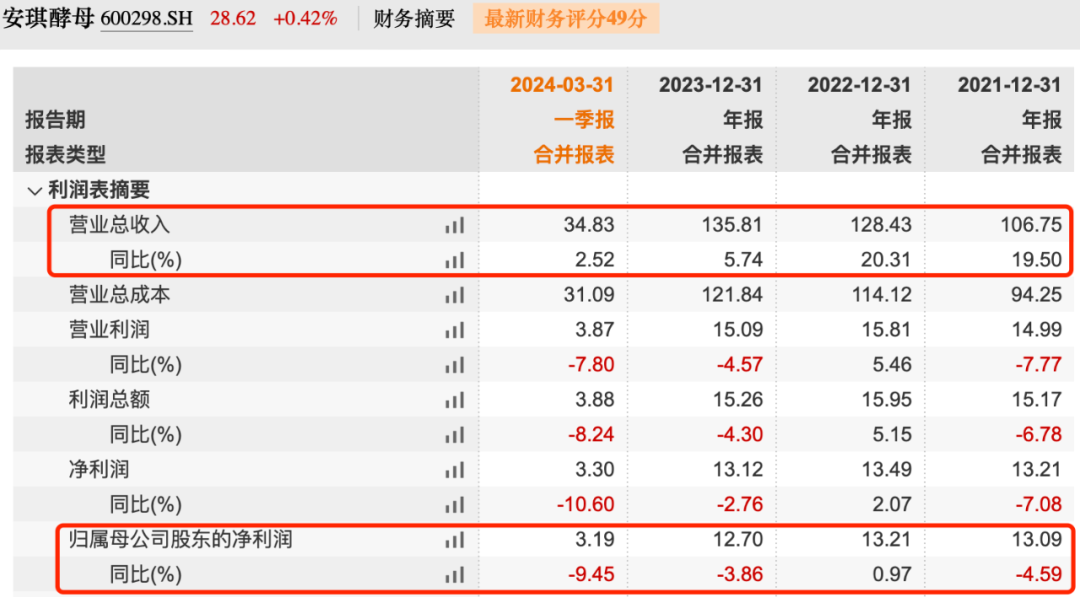 2024年一季度,安琪酵母“增收不增利”的状况仍在持续。4月19日,安琪酵母发布2024年一季报,报告期内,公司实现营业收入34.83亿元,同比增长2.52%;归母净利润3.19亿元,同比下滑9.45%。