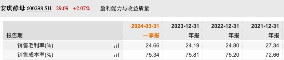 成本增长也导致公司毛利率走低。2021年-2023年,安琪酵母销售毛利率分别为27.34%、24.80%和24.19%,也呈现下滑趋势。