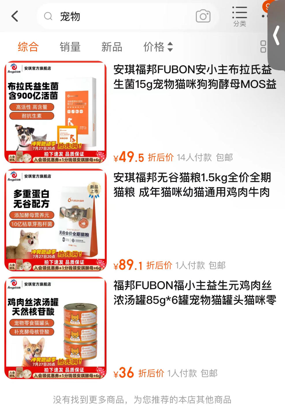 例如,安琪酵母还推出了宠物用品,包括猫粮、狗粮以及猫砂等产品,但在安琪酵母天猫旗舰店上显示的销量并不高,且知名度也不强。