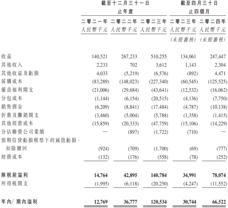 2021年至2023年及2024年前4月(报告期内),汇舸环保实现收益分别是1.41亿元、2.67亿元、5.1亿元及2.47亿元,期内溢利分别是1276.9万元、3677.7万元、1.21亿元、6652.2万元。