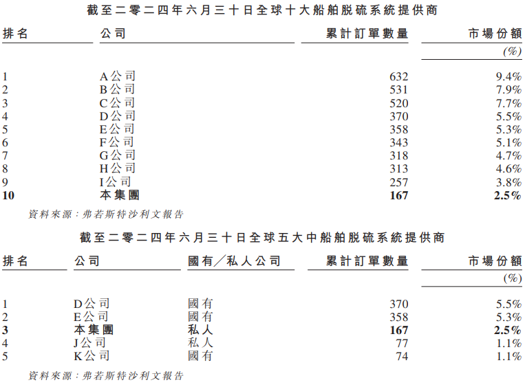 招股书显示,汇舸环保已获得167份订单,在全球船舶ESG解决方案市场排名第十,在中国供货商中排名第三,在中国民营船舶脱硫系统提供商中排名第一。
