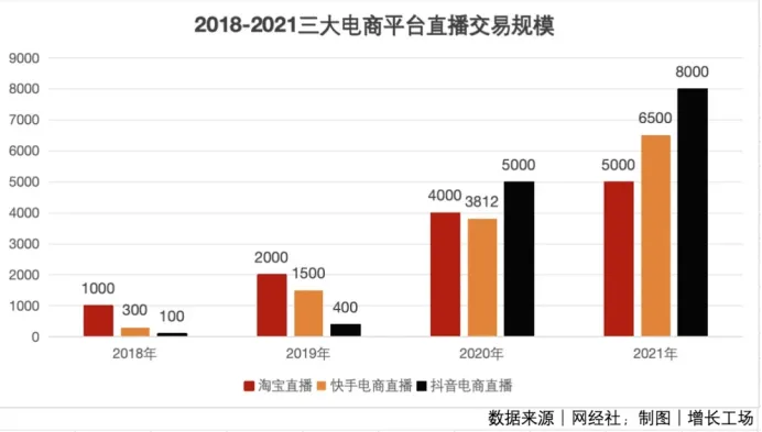 以快手为例,据“网经社”数据显示,2020年,快手电商直播交易规模为3812亿元,淘宝直播交易规模为4000亿元,淘宝直播还算勉强超过快手;而到了2021年,快手电商直播的交易规模为6500亿元,淘宝直播交易规模5000亿元,快手已经完成了对淘宝直播的反超。