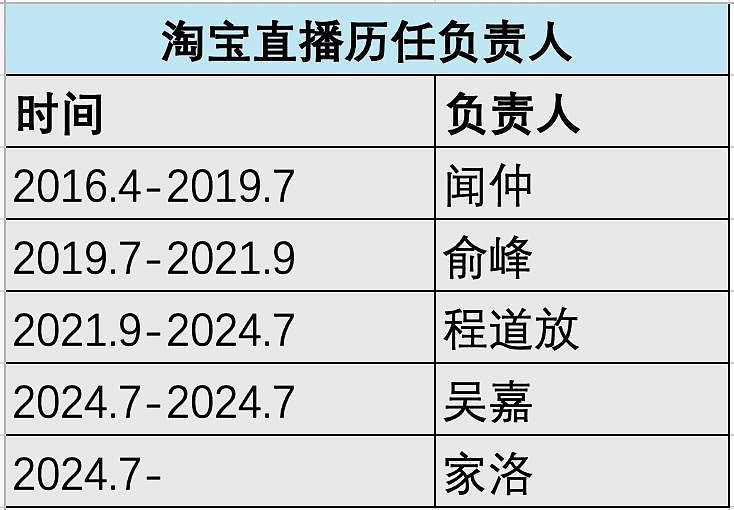 7月4日,淘宝直播的原“一把手”淘宝内容电商负责人程道放被调岗,淘天用户平台事业部与阿里妈妈事业部负责人吴嘉将接任该职位。仅一周后,有报道称,7月12日,天猫负责人家洛将兼任淘宝直播和内容负责人。