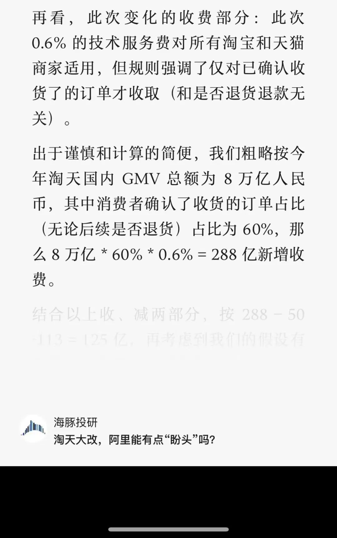 此次淘天调整的收费部分:0.6% 的技术服务费对所有淘宝和天猫商家适用,但规则强调了仅对已确认收货了的订单才收取(和是否退货退款无关)。据长桥集团旗下的二级市场投研品牌“海豚投研"粗略测算,按今年淘天国内 GMV 总额为 8 万亿人民币,其中消费者确认了收货的订单占比(无论后续是否退货)占比为 60%,那么 8 万亿 * 60% * 0.6% = 288 亿新增收费。