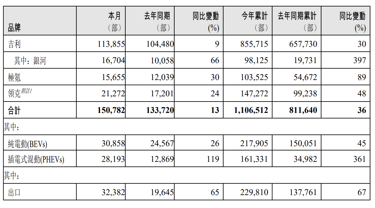 吉利汽车8月1日在港交所公告,集团7月销量为150,782部,同比增长约13%;本年累计销量1,106,512部,同比增长36%。其中,7月极氪销量为15,655部,同比增长30%;本年累计销量为103,525部,同比增长89%。