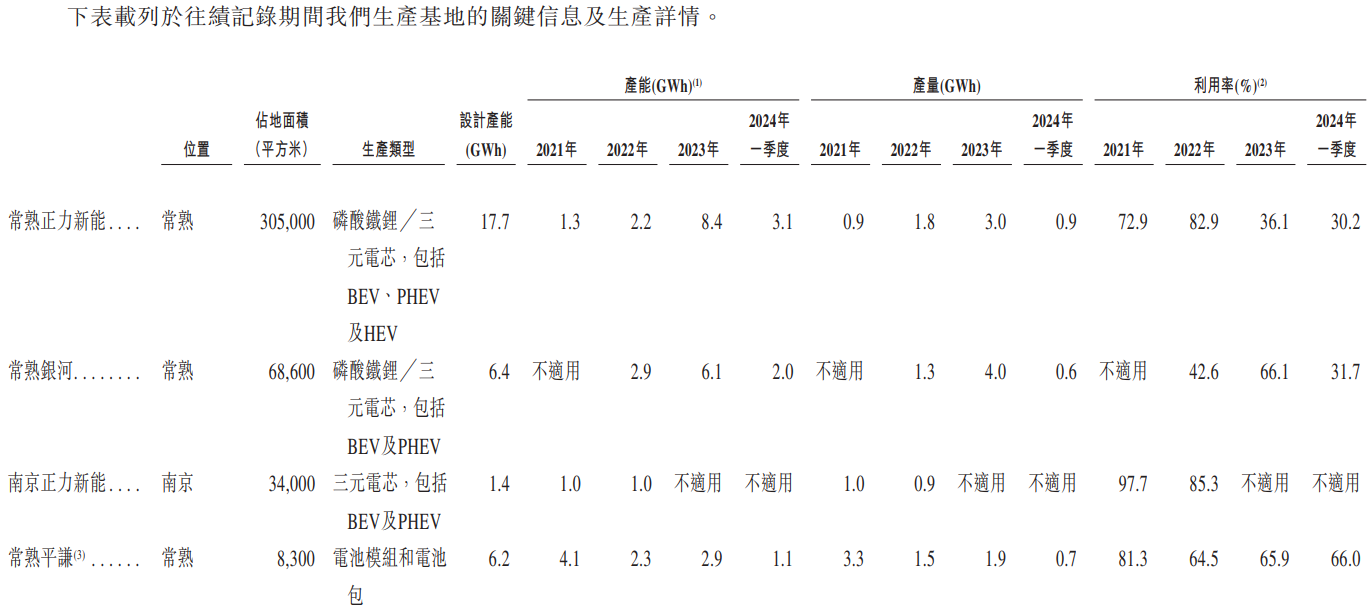 截至2024年3月31日,正力新能旗下电芯产品的设计总产能为25.5GWh,包括常熟正力新能、常熟银河及南京正力新能的设计产能。2021年至2023年及2024年前3月,公司总产能(包括电芯、模块及电池包)分别达到6.4GWh、8.5GWh、17.3GWh及6.1GWh。该公司预计到2026年其产能将增加至50.5GWh。