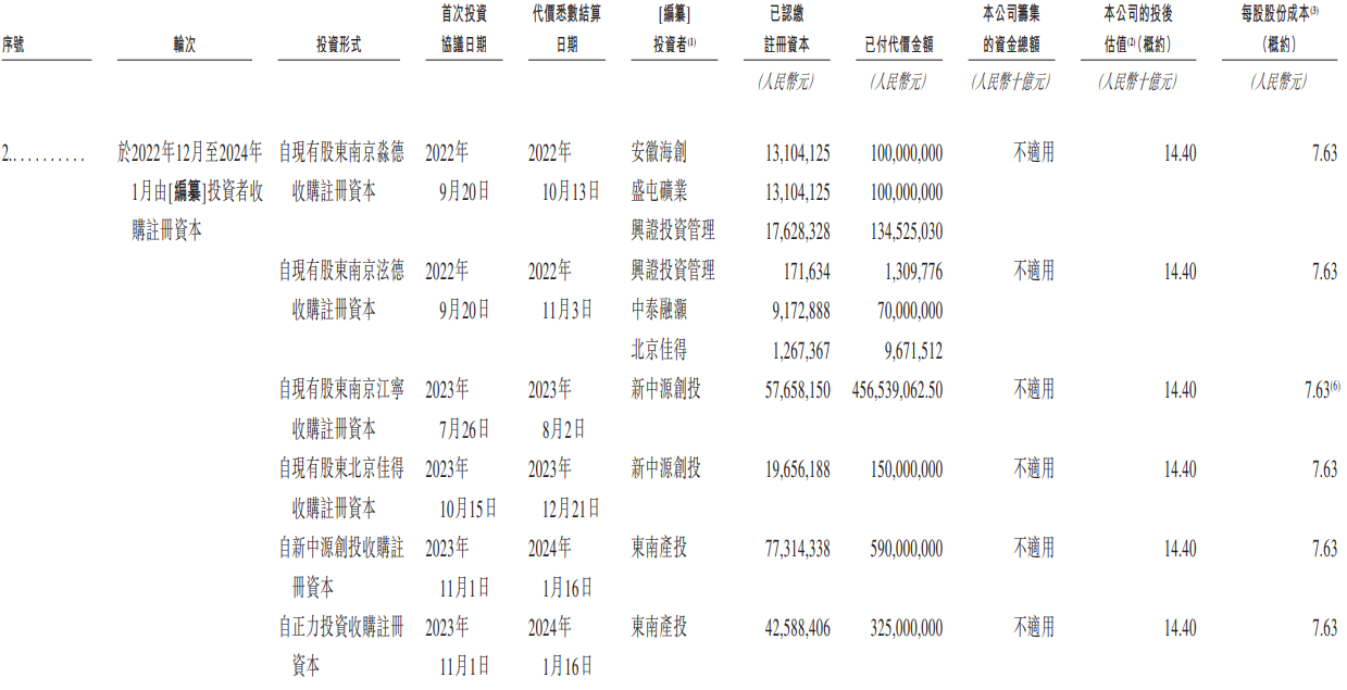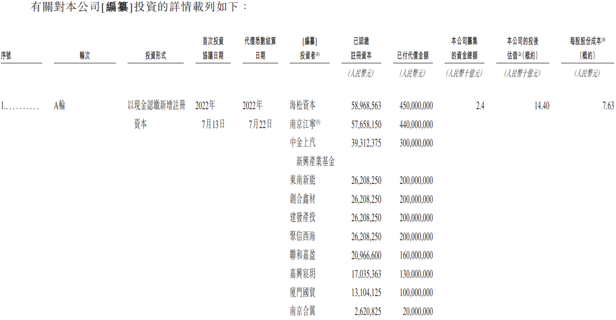 2022年以来,该公司曾先后完成三轮融资累计募资超53亿元,获得常熟国资东南投控、东南产投及东南新能,中金上汽新兴产业基金,建发产投,中信旗下聚信西海,兴证投资管理,盛屯矿业(600711.SH),厦门国贸等国资、上市公司的先后投资。于2024年7月完成的最新一轮融资后的公司估值为182亿元。